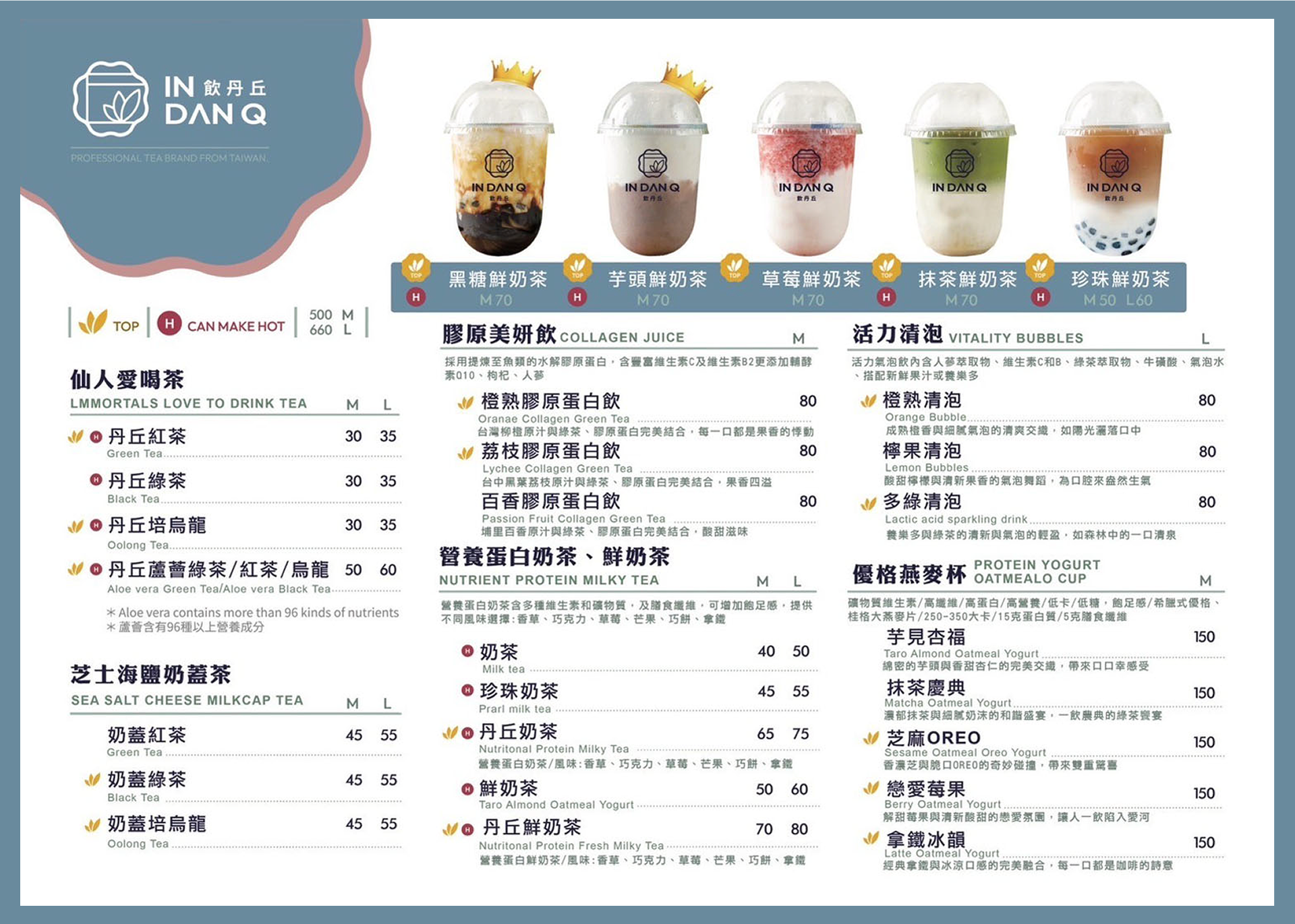 品牌的宗旨是「唯一在乎你健康的手搖飲」,我們的產品包括膠原美妍飲和優格果昔碗等。